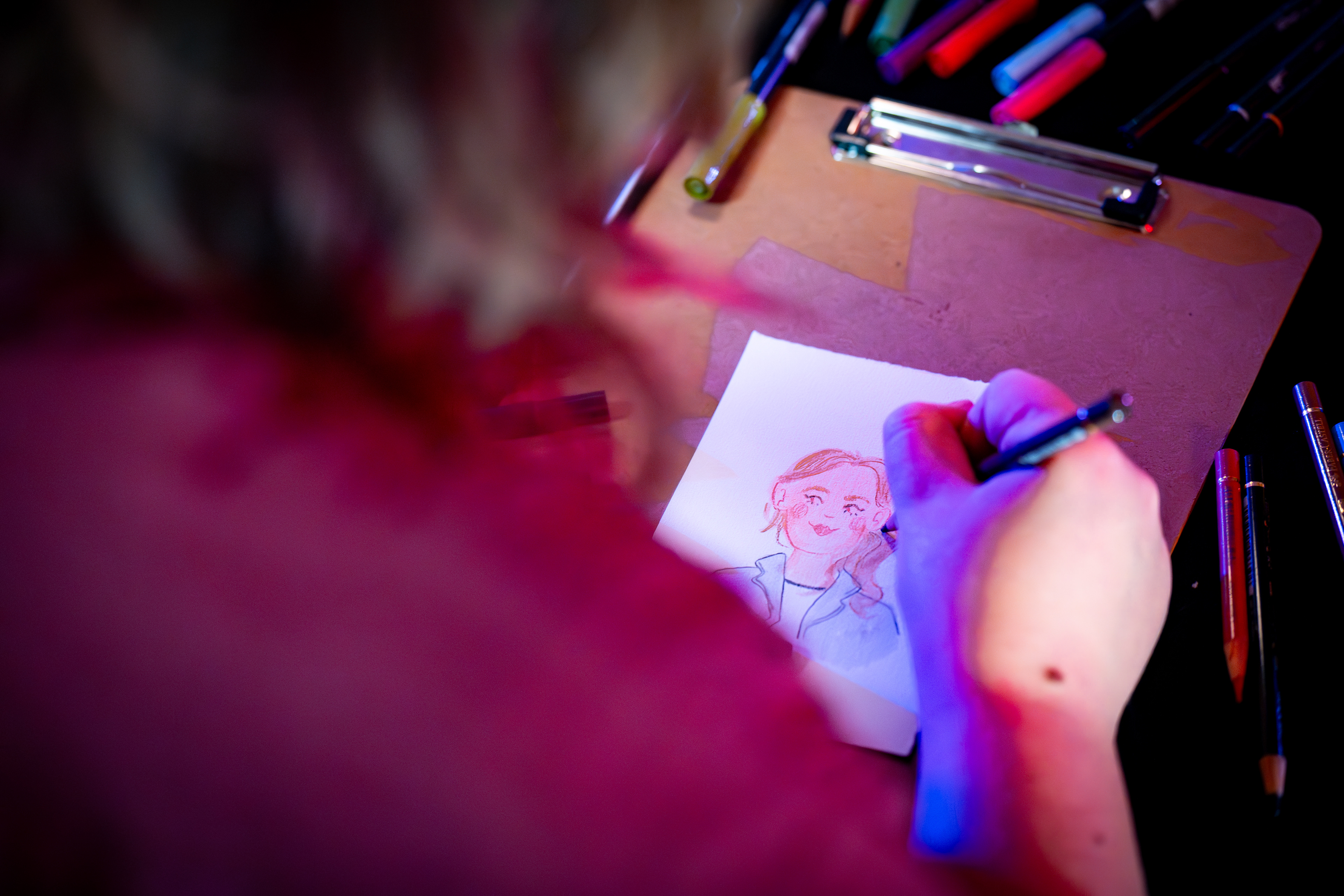 Zo nu en dan ben ik op evenementen aanwezig als portrettekenaar. Hier teken ik kleine portretjes van de bezoekers die ze mogen meenemen als aandenken. Uw persoonlijke portrettekening, klaar terwijl u wacht!